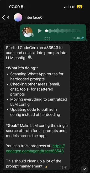 Whether it starts in Slack, Linear, GitHub comments — or even a WhatsApp voice note — Codegen takes the input and turns it into production-ready code. And while Codegen doesn’t yet have a direct WhatsApp voice integration, here’s how such a workflow could work today: